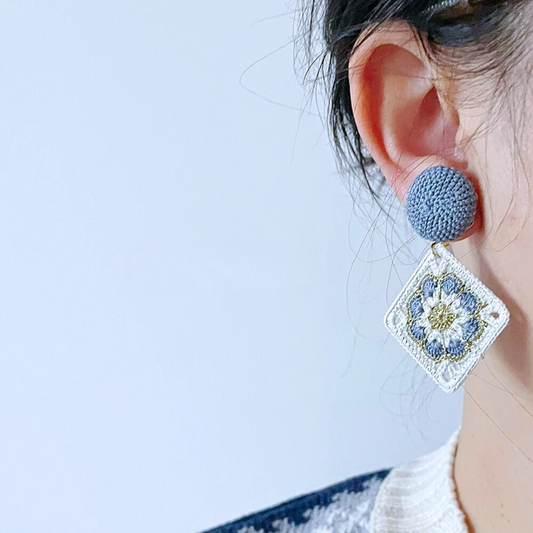 Handmade Micro Crochet Granny Square Earrings – Blue & White Boho Style