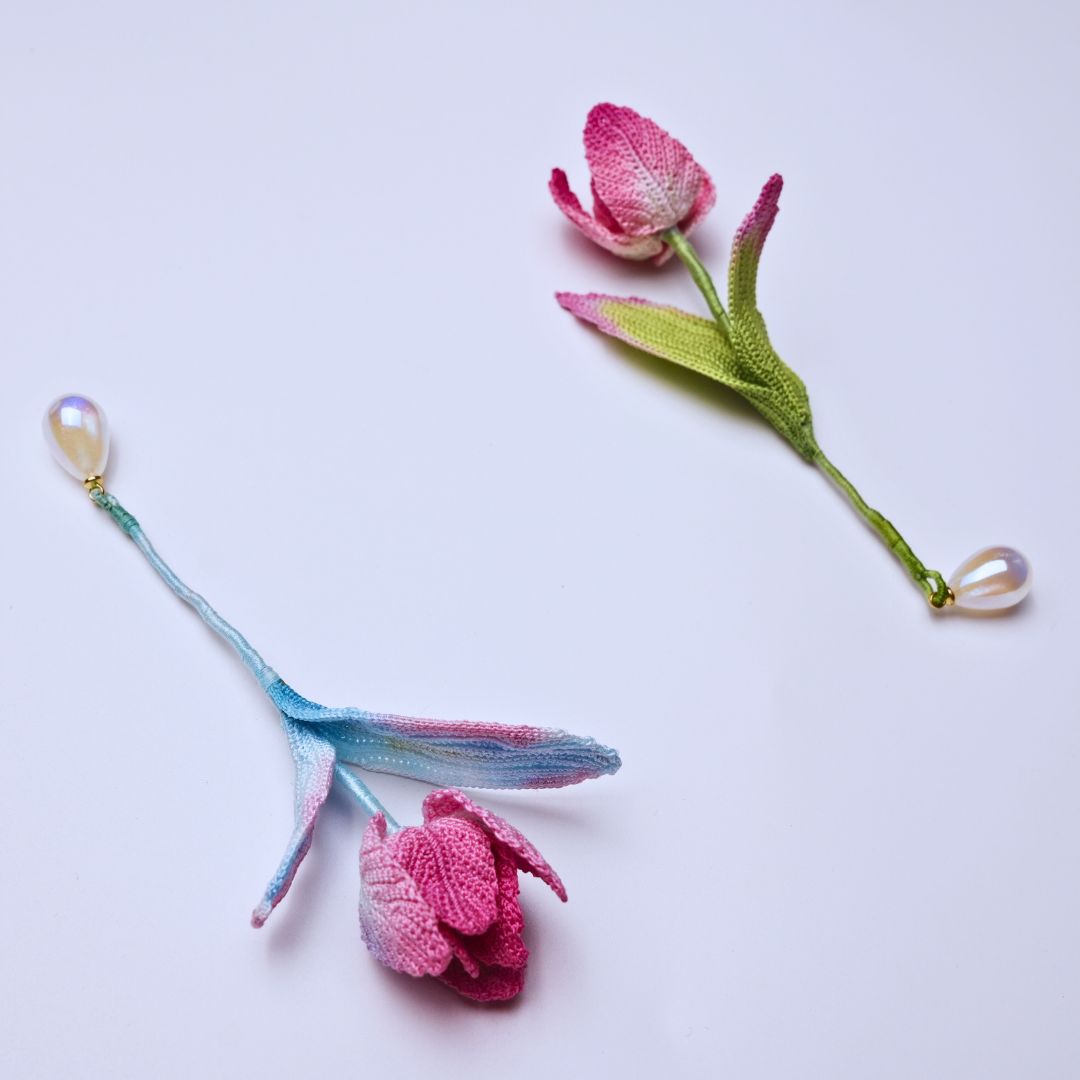 Inspired by the serene beauty of tulip gardens, these earrings are delicately handcrafted using ultra-fine 80-size lace thread and 999 silver hooks